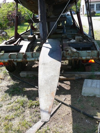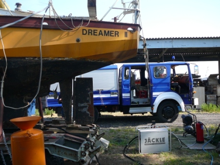 Nur, wie bekommt man das Blech schnell mal unters Boot? Mit drei Wagenheber! Hinten zwei vorne einer. Siehe Bilder:
